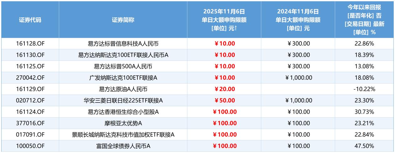 Wind数据显示,11月6日,有37只QDII单日最大申购限额低于100元,其中有4只单日仅限购10元,分别是易方达纳斯达克100ETF联接、易方达标普信息科技、易方达标普500和广发纳斯达克100ETF联接。