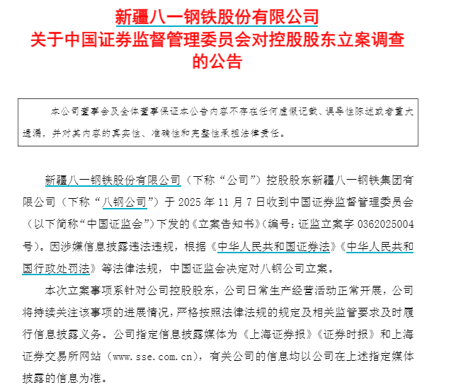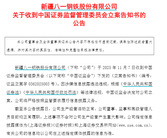八一钢铁同日公告,控股股东新疆八一钢铁集团有限公司(下称八钢公司)收到中国证监会下发的《立案告知书》。因涉嫌信息披露违法违规,中国证监会决定对八钢公司立案。八一钢铁称本次立案事项系针对公司控股股东,公司日常生产经营活动正常开展。