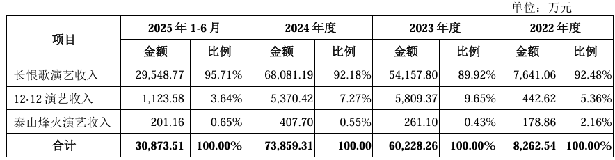 2022年至2024年度,陕西旅游旅游演艺业务收入分别为8262.54万元、6.02亿元、7.39亿元,其中《长恨歌》演艺收入的占比分别为92.48%、89.92%、92.18%。