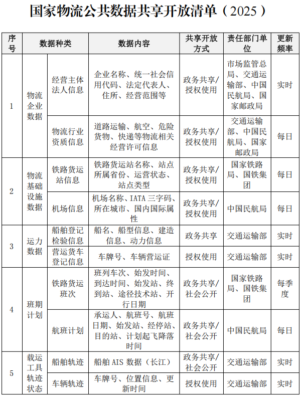 附:国家物流公共数据共享开放清单(2025)