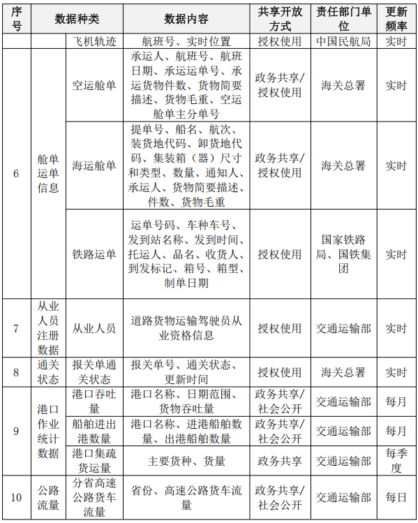 建立国家物流公共数据共享开放清单,根据行业管理和政务服务需要,明确物流公共数据共享范围,加强企业资质、从业人员、车船注册、通关物流等数据归集共享。