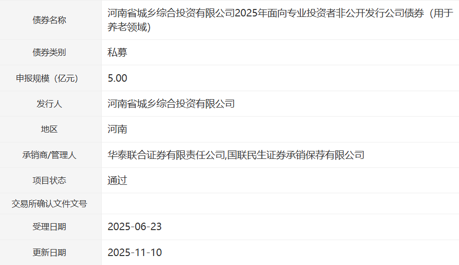【大河财立方消息】11月11日消息,河南省城乡综合投资有限公司2025年面向专业投资者非公开发行公司债券(用于养老领域)项目,获深交所通过。