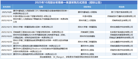 其他高值耗材项目中,漯河市中心医院连续发布3个单一来源采购项目,包括预算320万元的消化道内窥镜采购、预算120万元的超声探头采购,以及预算81.05万元的医科达后装治疗机配套施源器采购。郑州大学第一附属医院也发布了骨水泥、过氧化氢低温灭菌器专用消毒液等项目的单一来源采购公示。