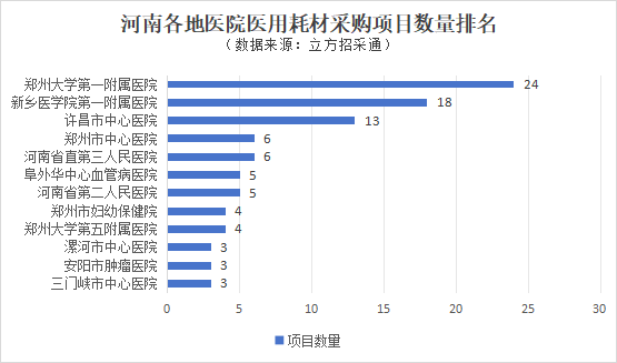 从招标单位来看,郑州大学第一附属医院以24条招标信息位居榜首,其采购内容覆盖试剂、高值介入耗材与设备配件等耗材。新乡医学院第一附属医院18条、许昌市中心医院13条分列第二、第三位。新乡医学院第一附属医院共有16个项目采用临时采购公开遴选模式,采购品类涵盖人造血管、离心泵泵头、胶原蛋白软骨修复支架等高值耗材。许昌市中心医院采购则按科室精细划分,病理科、核医学科、心血管内科等均发布了专项耗材采购项目。