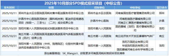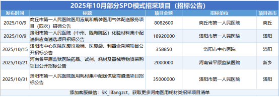 数据显示,10月的医用耗材招标项目中出现多个采用SPD服务模式的大额项目,其中洛阳市第一人民医院发布的“医用耗材集中配送供应商遴选项目”预算金额高达3500万元,为本月最大单笔采购项目。该项目分为4个标包,分别遴选眼科专用耗材、高值介入与植入耗材、普通耗材等品类的配送企业,签订3年服务期。此外,该院中州、陇海院区化验材料集中配送供应商遴选项目预算1892万元,最终由洛阳万国药业有限公司、华润洛阳医药有限公司和国药器械河南生命科学有限公司3家企业中标。