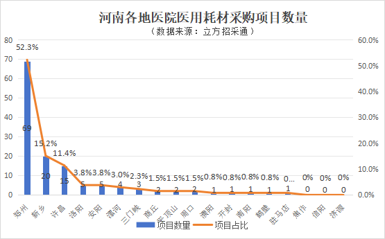从招标项目地域分布来看,郑州、新乡、许昌仍是全省医用耗材招标的集中区域。其中,郑州发布招标信息69条,占全省总量的52.3%;新乡发布20条,占比15.2%;许昌发布15条,占比11.4%。三地合计占比近八成。洛阳、安阳各有5条,平顶山、漯河分别发布2条和4条,其余地市项目数量较少,焦作、信阳、济源三地未发布医用耗材招标信息。
