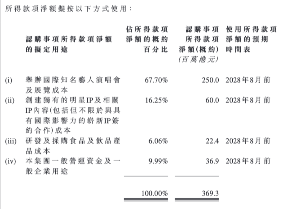 巨星传奇表示,募资所得款项总额预期为3.924亿港元。其中,公司拟将募资款项的67.70%,约2.5亿港元用于举行国际知名艺人演唱会及展览;募资总额的16.25%,约6000万港元用于创建独有的明星IP及相关IP内容;募资总额的6.06%,约2240万港元将用于研发及采购食品、饮品产品。
