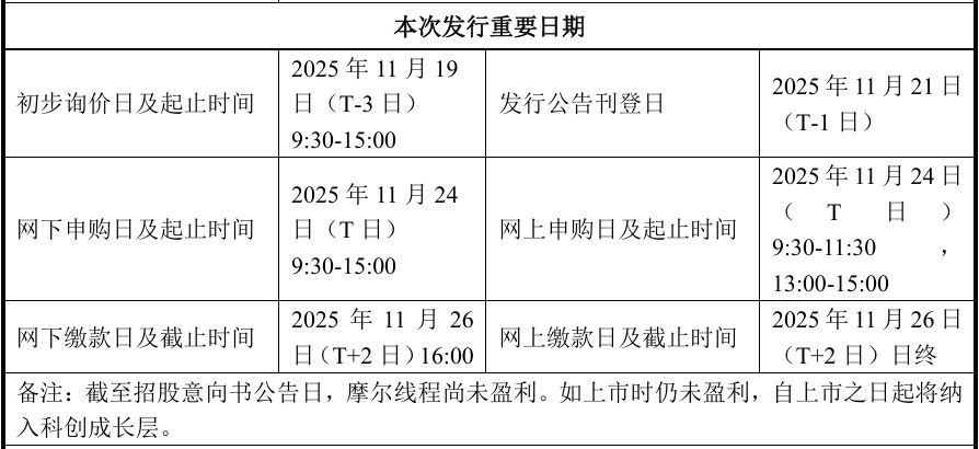 招股意向书中,摩尔线程公布公开发行日期为2025年11月24日,预计发行新股7000万股,其中网上初始发行1120万股、网下初始发行4480万股、初始战略配售1400万股。