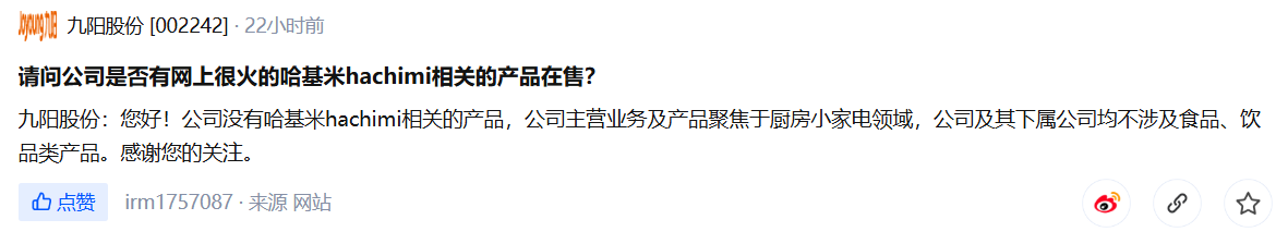 尽管标有“九阳豆浆”,但上市公司九阳股份却表示,公司没有哈基米hachimi相关的产品,公司主营业务及产品聚焦于厨房小家电领域,公司及其下属公司均不涉及食品、饮品类产品。