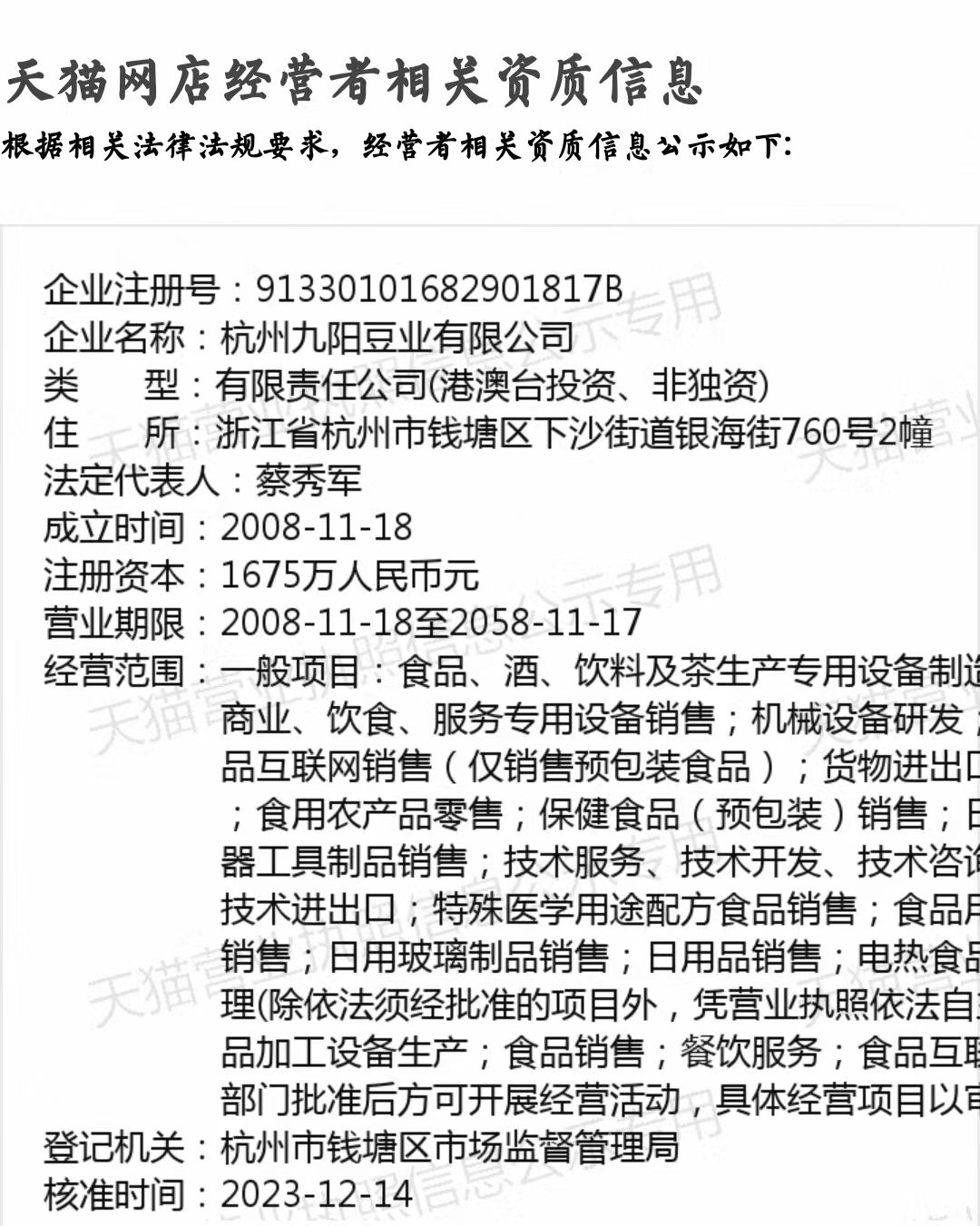 从该产品店铺资质证照也能看到,“九阳豆浆”企业名称为杭州九阳豆业有限公司,注册资金1675万元,法人姓名为蔡秀军。
