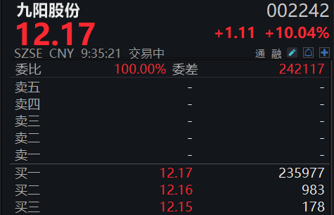 【大河财立方消息】11月14日,九阳股份再次涨停,收获二连板,最新报12.17元/股。