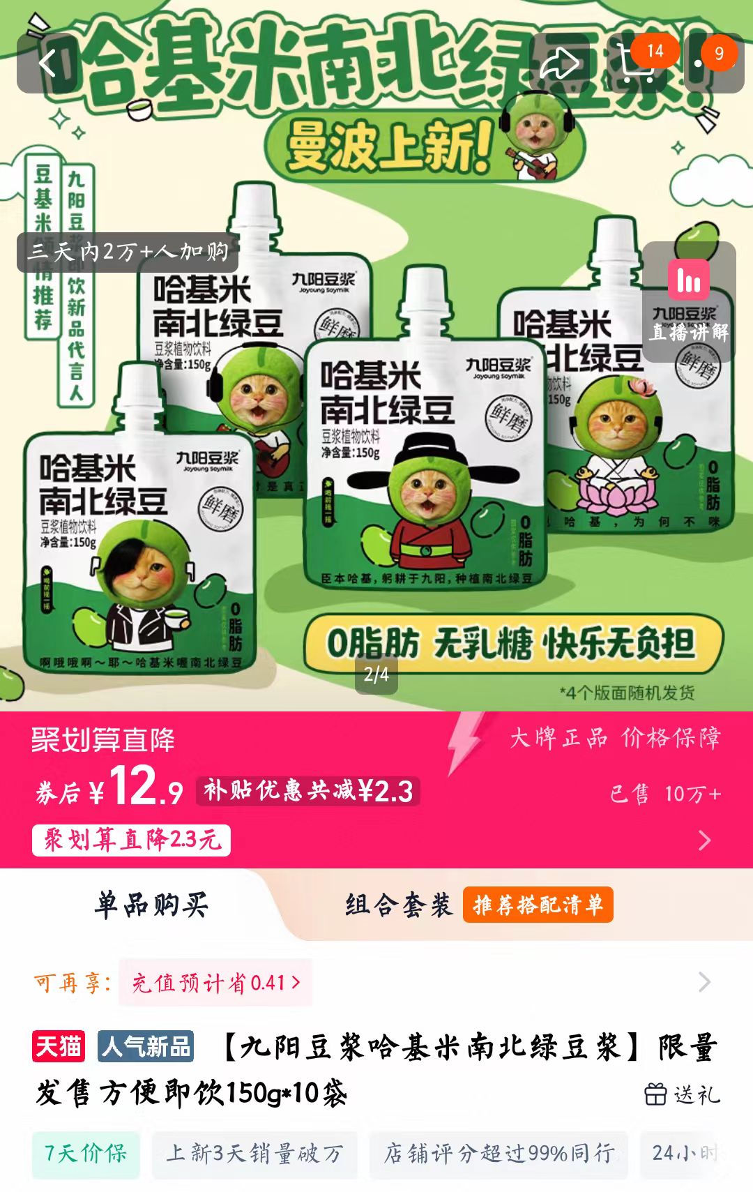 消息面上,近期,一款名为“哈基米南北绿豆浆”的产品走红网络,吸引不少网友购买。商品信息显示,该款产品右上角标有“九阳豆浆”的文字,券后价格12.9元10袋。