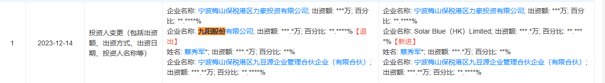 但天眼查App变更记录显示,2023年12月,九阳股份已退出杭州九阳豆业有限公司股东行列。目前,上述两公司已无直接股权关联。