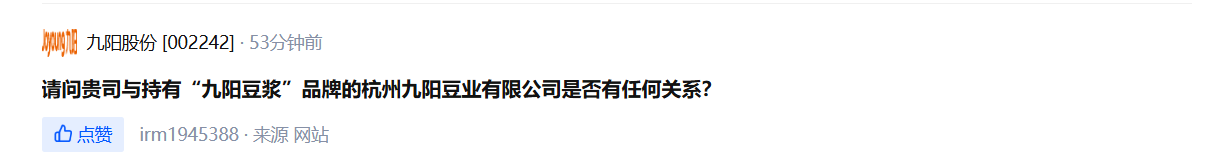 而九阳股份是否与持有“九阳豆浆”品牌的杭州九阳豆业有限公司存在关系,也有投资者提出了相关问询,但截至发稿,九阳股份并未回复。