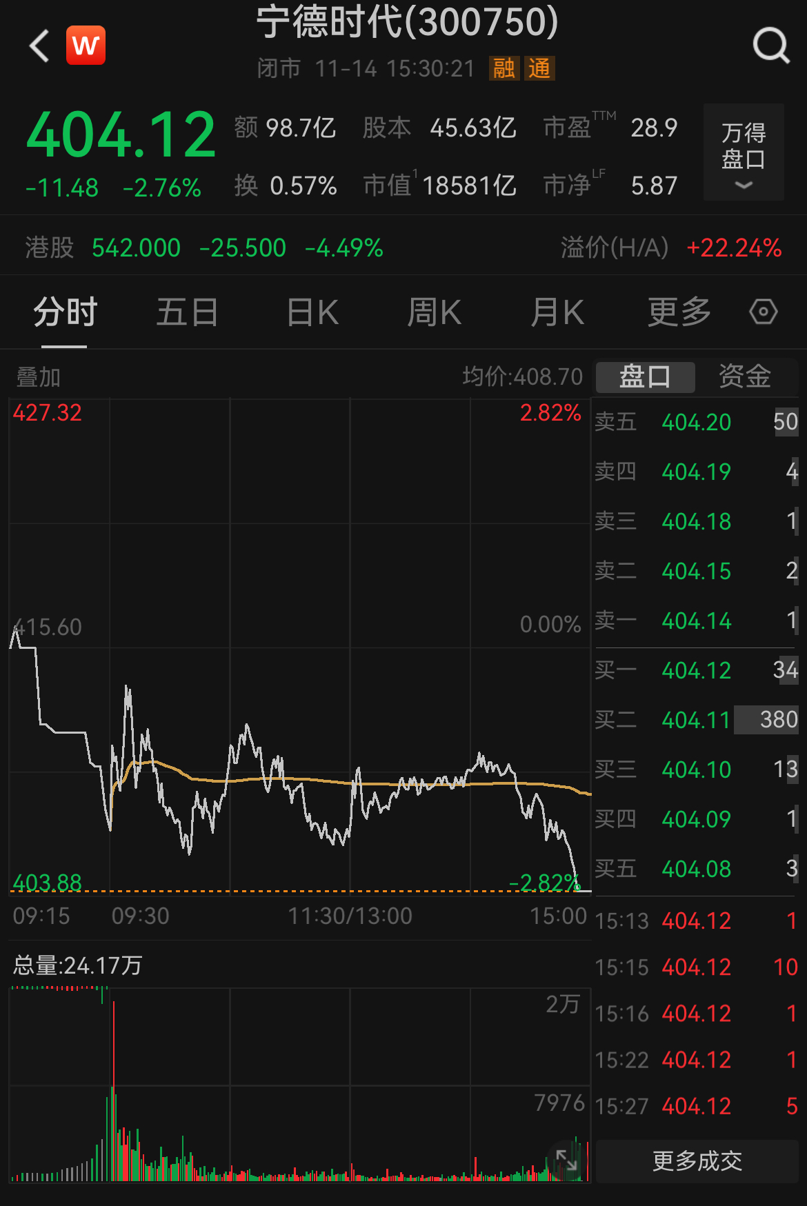 以宁德时代11月14日收盘价404.12元计算,黄世霖本次拟出让的4563.24万股股份对应市值约184.4亿元。黄世霖为宁德时代核心创始人之一。