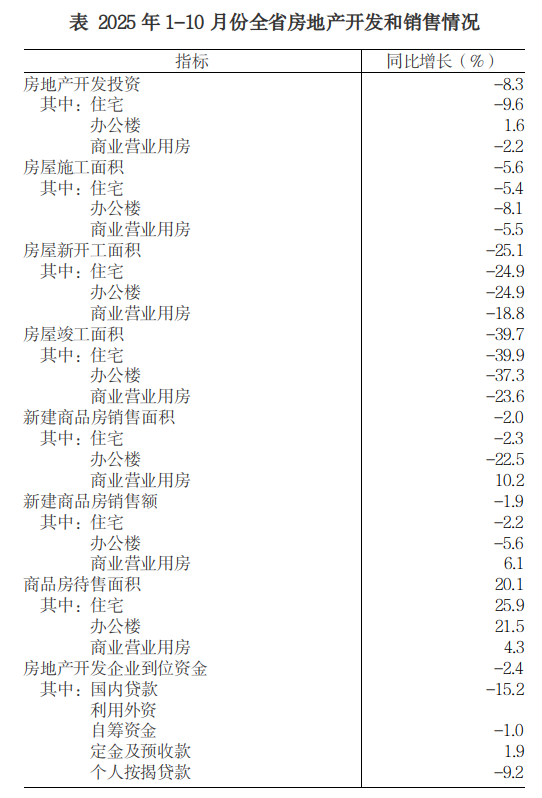 1-10月份,全省房地产开发投资同比下降8.3%,降幅低于全国6.4个百分点。其中,住宅投资下降9.6%。