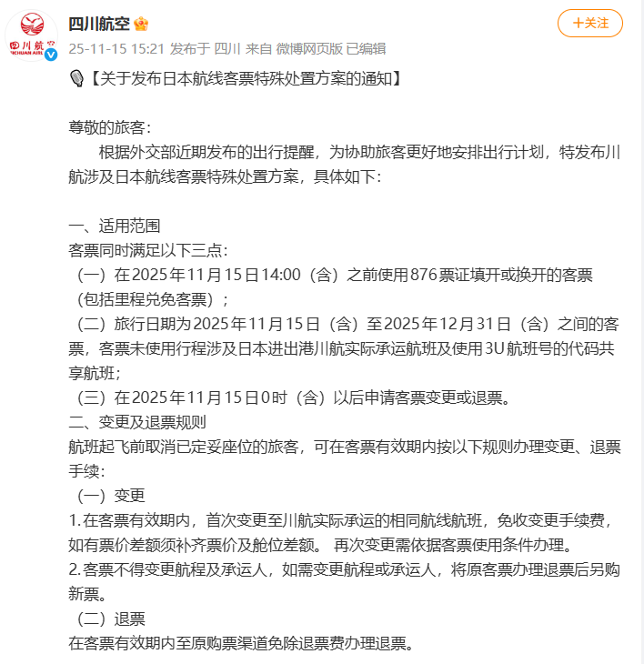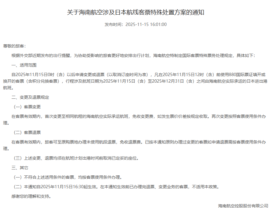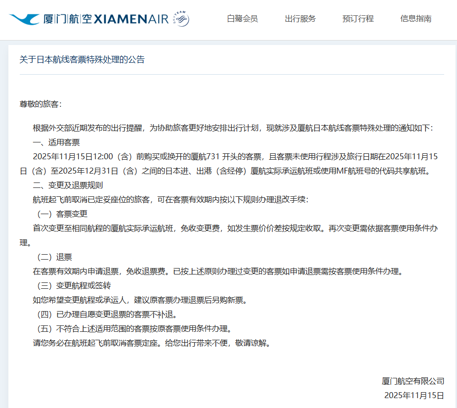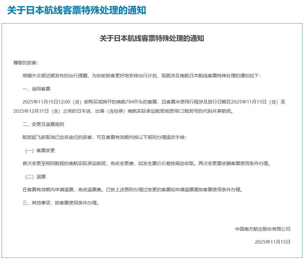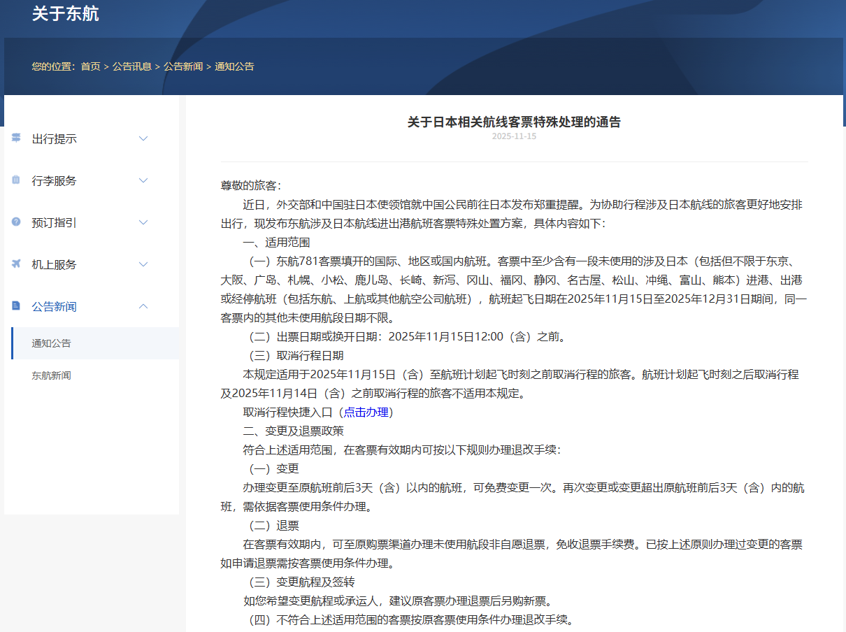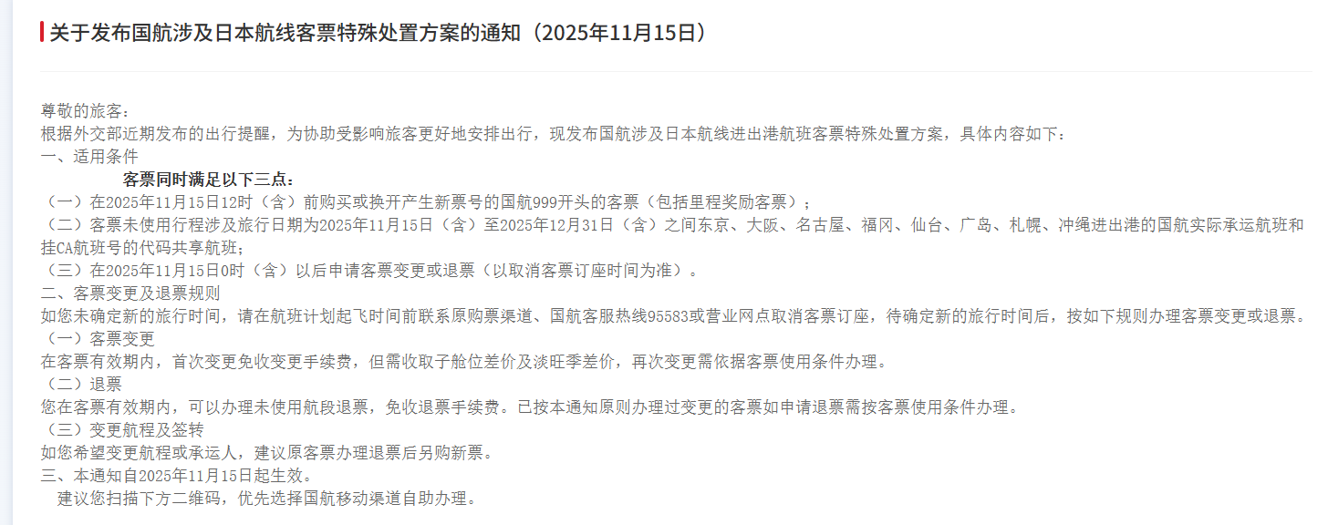 其中,国航在通知中明确,对于在今年11月15日12时(含)前购买或换开产生新票号的国航999开头的客票(包括里程奖励客票);客票未使用行程涉及旅行日期为2025年11月15日(含)至2025年12月31日(含)之间东京、大阪、名古屋、福冈、仙台、广岛、札幌、冲绳进出港的国航实际承运航班和挂CA航班号的代码共享航班;在2025年11月15日0时(含)以后申请客票变更或退票(以取消客票订座时间为准)。在客票有效期内,首次变更免收变更手续费,但需收取子舱位差价及淡旺季差价,再次变更需依据客票使用条件办理。在客票有效期内,可以办理未使用航段退票,免收退票手续费。