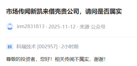 【大河财立方消息】11月17日,科瑞技术在投资者互动平台表示,市场关于深圳市新凯来技术有限公司(以下简称新凯来)借壳公司的相关传闻不属实。