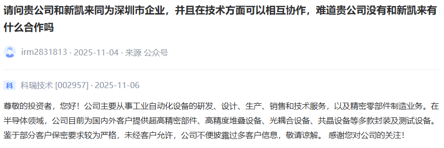 而关于公司是否与新凯来有合作关系,科瑞技术曾表示,公司主要从事工业自动化设备的研发、设计、生产、销售和技术服务,以及精密零部件制造业务。在半导体领域,公司目前为国内外客户提供超高精密部件、高精度堆叠设备、光耦合设备、共晶设备等多款封装及测试设备。鉴于部分客户保密要求较为严格,未经客户允许,公司不便披露过多客户信息。