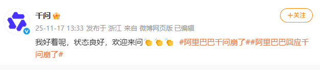 【大河财立方消息】11月17日上午,千问App上线之后出现无法注册以及访问异常等情况,疑似因用户涌入过载,部分服务出现拥堵和中断。随后,“阿里巴巴千问崩了”相关话题冲上微博热搜。