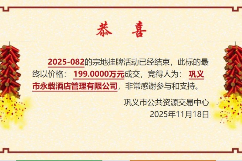 11月18日消息,郑州市巩义市2025-082号宗地完成挂牌转让,成交价格199万元。竞得人巩义市永载酒店管理有限公司当日即与巩义市资源规划局、相关村集体经济组织签订了国有(集体)建设用地成交确认书及履约监管协议。这标志着河南省首宗“国有+集体”建设用地跨权属组合供应项目正式落地,为土地要素市场化配置改革提供了“河南样本”。