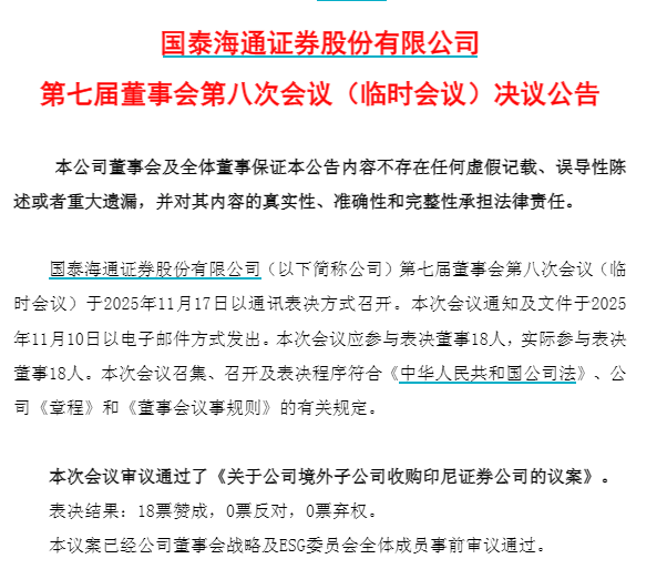 11月17日晚间,国泰海通证券发布公告称,公司董事会议审议通过了《关于公司境外子公司收购印尼证券公司的议案》,同意由其境外子公司收购印尼当地证券公司。这是该券商在布局新加坡、越南子公司之后,首次将业务拓展至印尼这一新兴市场,也标志着其在东南亚市场的战略布局再进一步。