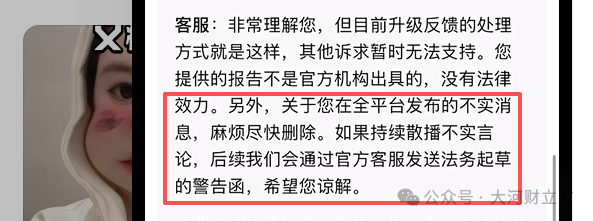 但从消费者发布的与商家客服沟通录音中可了解,商家升级处理后仅支持“退货退款”方案,且要求消费者将退款理由修改为“7天无理由/不喜欢”。客服称“用户提供的第三方报告无法律效力,无法支持其他诉求”,更明确要求消费者“尽快删除相关不实信息,若持续散播不实言论,后续会发送法务起草警告函”。