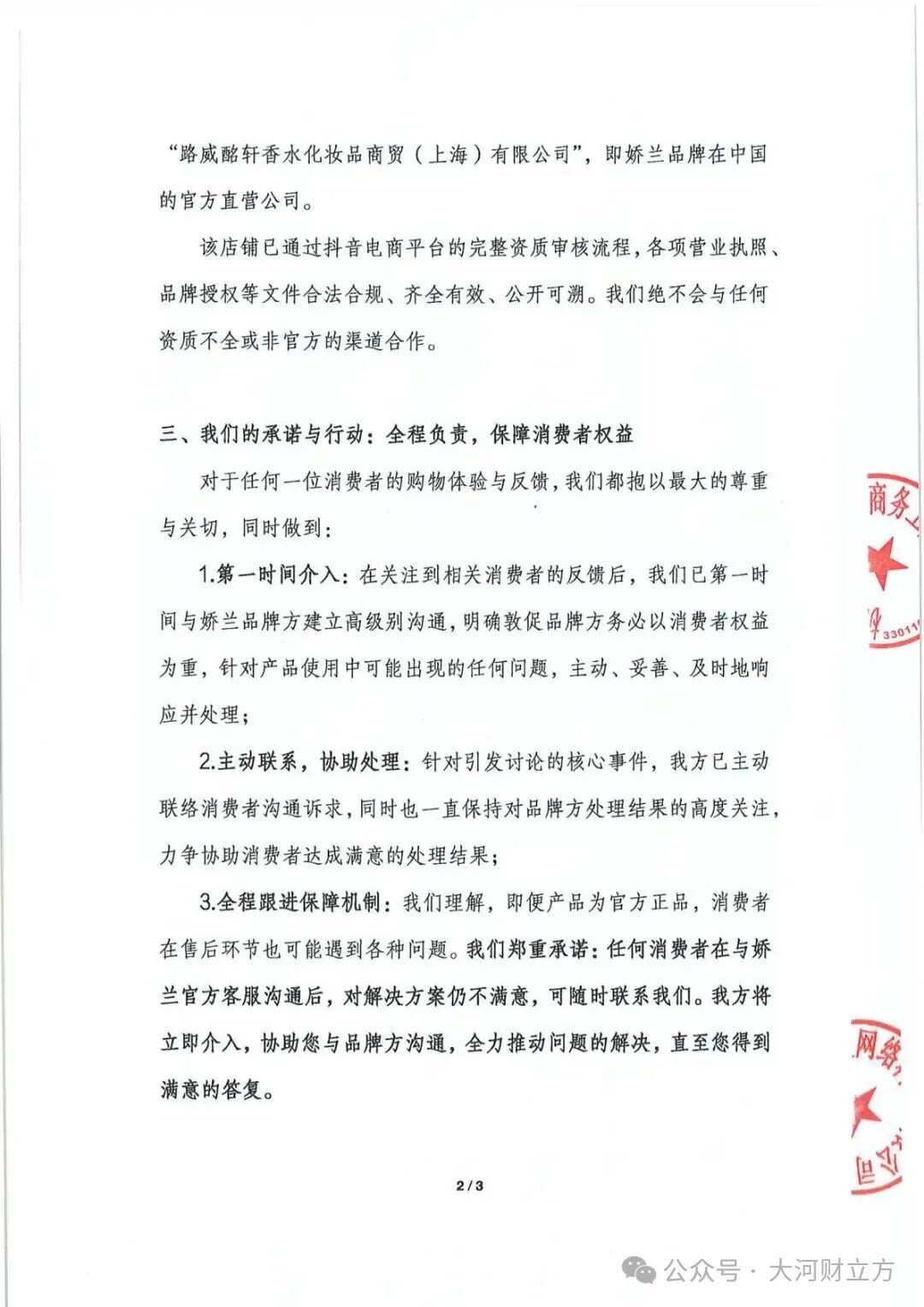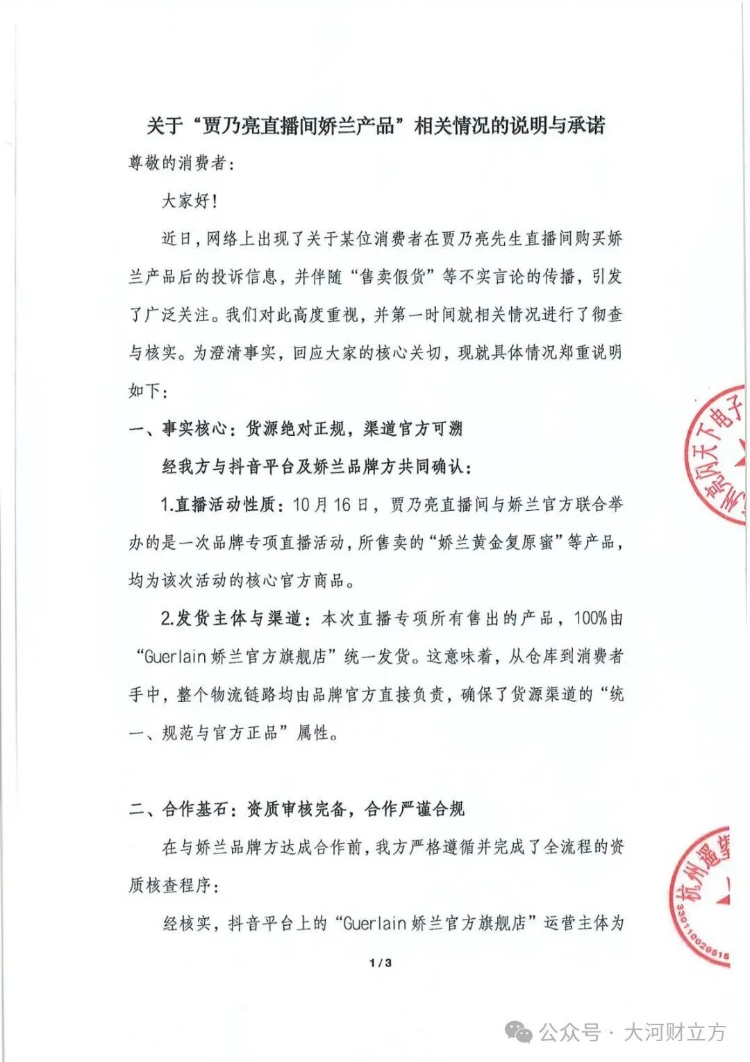 11月18日,遥望科技回应大河财立方记者:“直播间所售娇兰产品均由Guerlain娇兰官方旗舰店统一发货,运营主体为路威酩轩香水化妆品商贸 (上海) 有限公司,是娇兰品牌在中国的官方直营公司。”