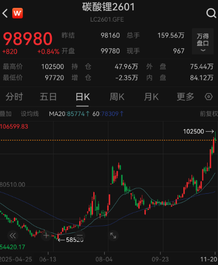 11月以来,碳酸锂期货主力合约持续发力,19日,碳酸锂期货主力合约盘中冲破10万元/吨关口,这是自2024年6月以来的首次突破,月内碳酸锂期货主力合约累计涨幅超20%。拉长时间看,若从年内低点5.85万元/吨计算,碳酸锂期货价格反弹超70%。