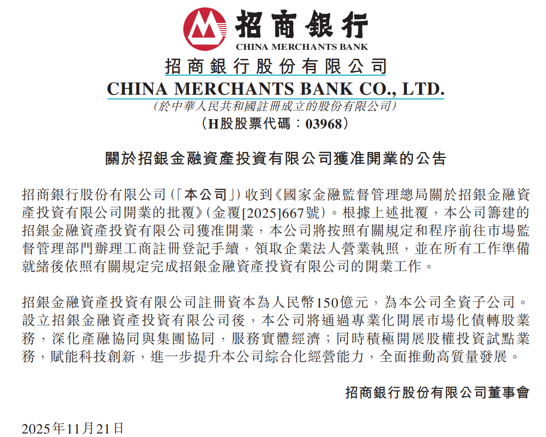 11月21日晚间,招商银行发布公告称,公司收到国家金融监督管理总局批复,公司筹建的招银金融资产投资有限公司(简称招银金融投资)获准开业。