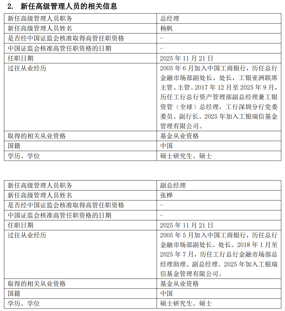公告披露,自2025年11月21日起,杨帆任公司总经理、张桦任公司副总经理。公告称,上述变更事项,经工银瑞信基金管理有限公司董事会2025年第5次会议审议并通过,并按规定报监管机构备案。