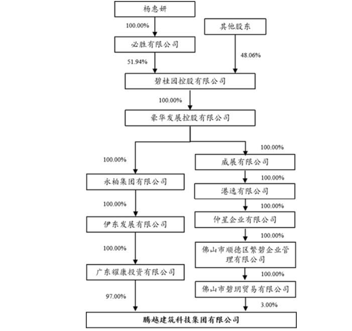 公开信息显示,腾越建筑成立于1997年3月,注册资本54亿元,控股股东为广东耀康投资有限公司,实际控制人为杨惠妍。