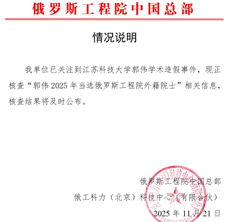 【大河财立方消息】11月23日消息,俄罗斯工程院中国总部近日发布情况说明称,已关注到江苏科技大学郭伟的学术造假事件,现正核查“郭伟2025 年当选俄罗斯工程院外籍院士”相关信息,核查结果将及时公布。