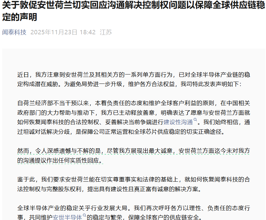 【大河财立方消息】11月23日,闻泰科技发布声明,敦促安世荷兰切实回应沟通解决控制权问题以保障全球供应链稳定。