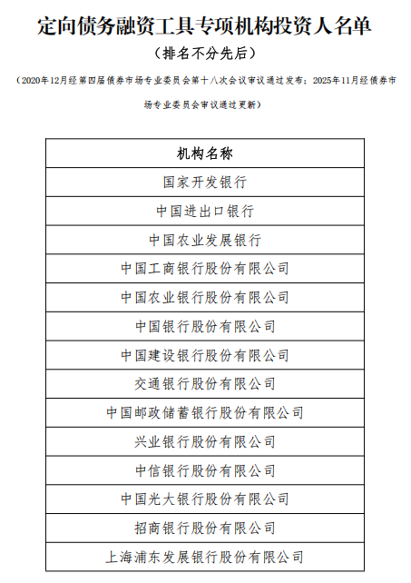 【大河财立方消息】11月24日消息,为持续提升定向发行产品投资交易便利、改善二级市场流动性,加强定向投资人队伍建设,进一步完善投资人分层制度安排,中国银行间市场交易商协会评估更新《定向债务融资工具专项机构投资人名单》,经债券市场专业委员会审议通过,现予发布,自发布之日起施行。