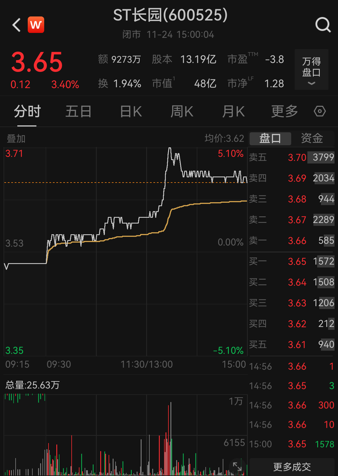 截至11月24日收盘,ST长园报3.65元/股,收涨3.40%,市值48亿元。