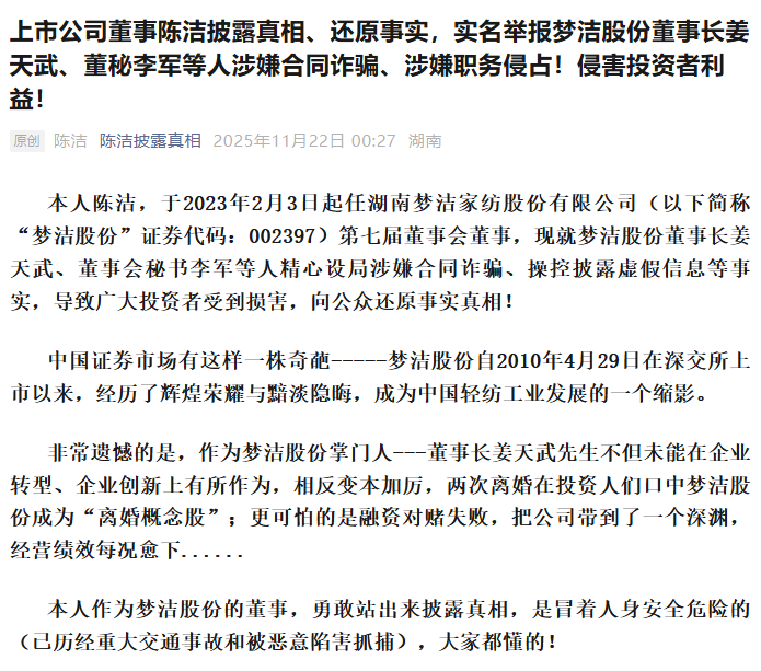 日前,自称梦洁股份第七届董事会董事的陈洁,通过个人社交平台发文称,实名举报梦洁股份董事长姜天武、董秘李军等人涉嫌合同诈骗、涉嫌职务侵占。