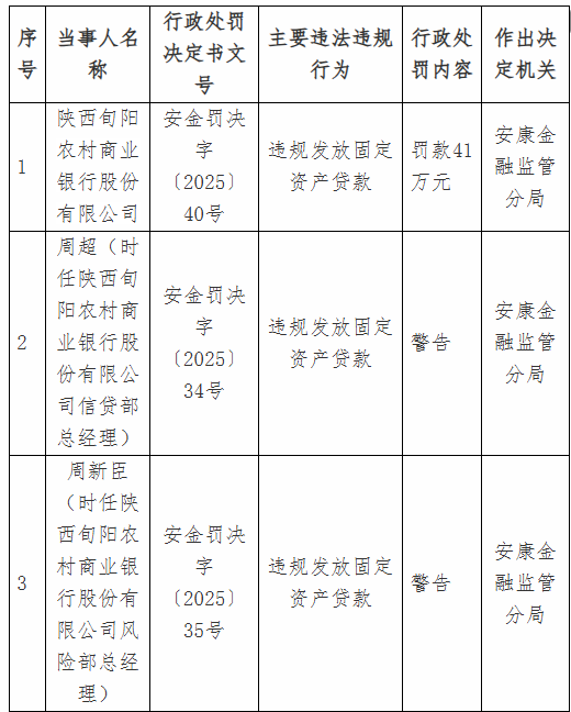 【大河财立方消息】11月25日,国家金融监督管理总局安康监管分局披露的行政处罚信息公示表显示,陕西旬阳农村商业银行股份有限公司因违规发放固定资产贷款被罚款41万元。