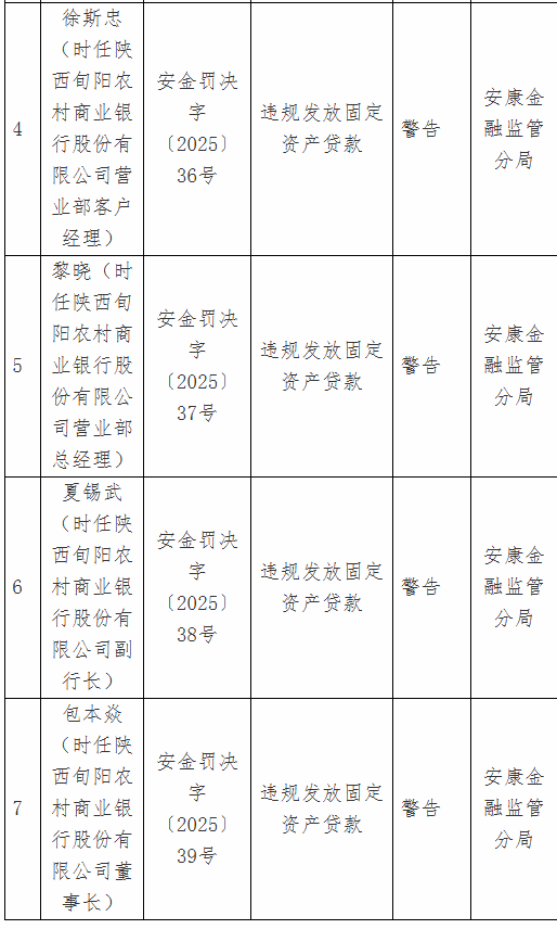 同时,时任信贷部总经理周超、时任风险部总经理周新臣、时任营业部客户经理徐斯忠、时任营业部总经理黎晓、时任副行长夏锡武、时任董事长包本焱因违规发放固定资产贷款,被警告。