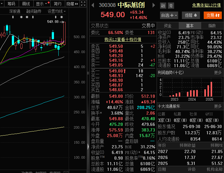 【大河财立方消息】11月26日,截至发稿,中际旭创上涨14.46%,报549元/股,总市值突破6000亿元。