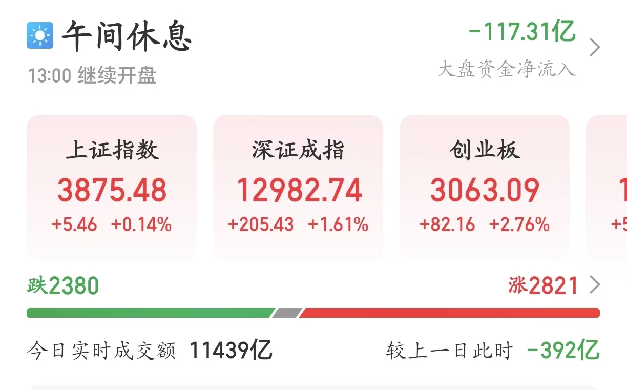 【大河财立方消息】11月26日上午收盘,沪指上涨0.14%,报3875.48点;深成指涨1.61%,创业板指涨近3%。沪深两市半日成交额1.14万亿,较上个交易日缩量392亿。