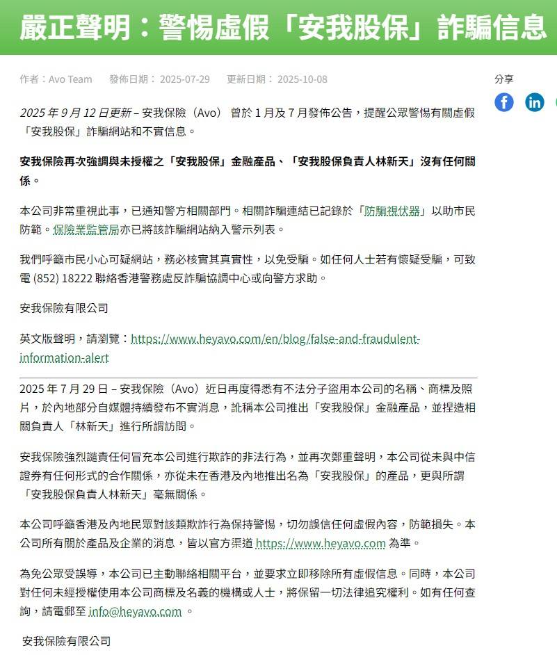 不过,这一系列宣传很快就被涉及的相关机构澄清警示。在香港,确实有一家名为安我保险(Avo)的虚拟一般保险公司,该公司于今年1月、7月、9月分别发布了三条澄清公告,称部分自媒体持续发布不实消息,讹称本公司推出“安我股保”金融产品,并捏造相关负责人“林新天”进行所谓访问。