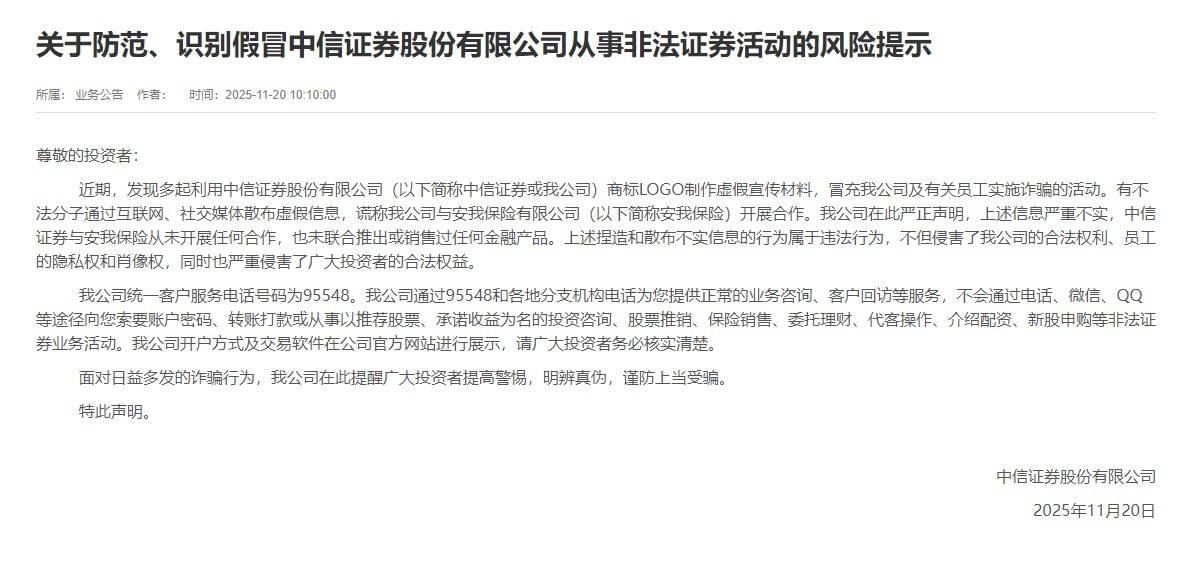中信证券也于10月20日发布了风险提示,称有不法分子通过互联网、社交媒体散布虚假信息,谎称中信证券与安我保险有限公司开展合作。公司严正声明,上述信息严重不实,中信证券与安我保险从未开展任何合作,也未联合推出或销售过任何金融产品。上述捏造和散布不实信息的行为属于违法行为。