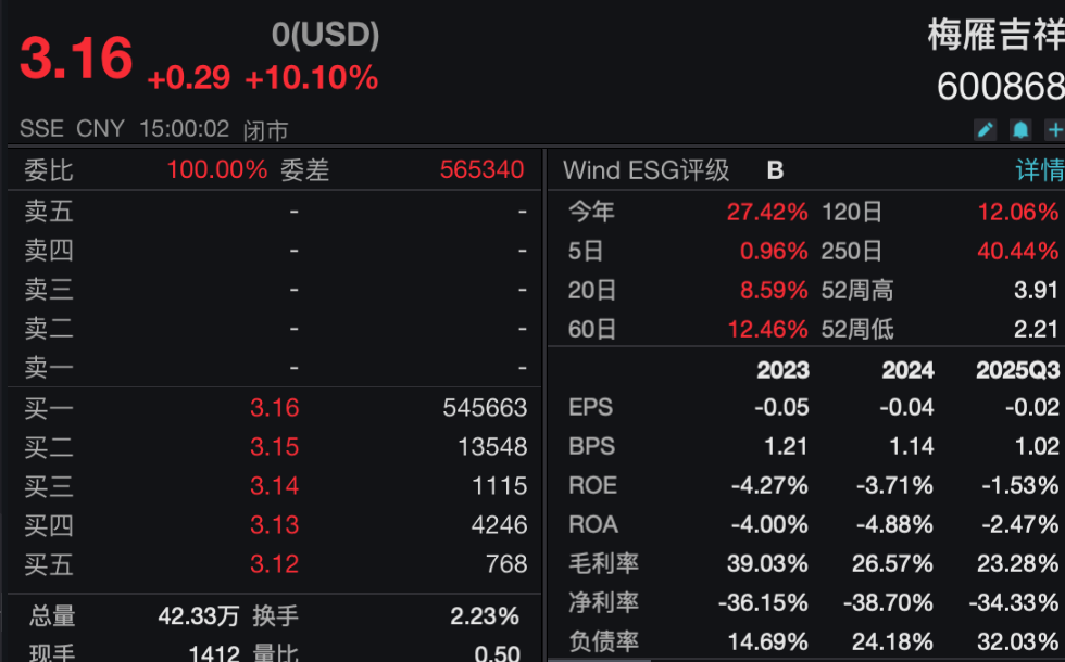 记者注意到,今日梅雁吉祥开盘后涨停,报3.16元/股,上涨10.10%。