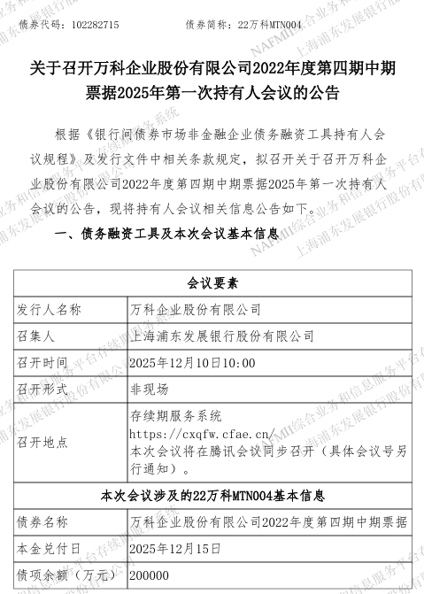公告显示,万科企业股份有限公司2022年度第四期中期票据债券简称为“22万科MTN004”,债项余额20亿元,本金兑付日为2025年12月15日。本次会议召集人为上海浦东发展银行股份有限公司,召开时间为2025年12月10日10:00。