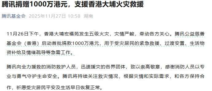 【大河财立方消息】11月27日,腾讯公益慈善基金会(香港)宣布,启动首批捐款1000万港元,用于香港大埔火灾受灾居民的紧急救援、过渡安置、生活物资补给及情绪疏导等急需工作。