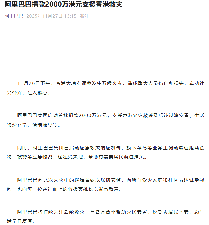 阿里巴巴集团启动首批捐款2000万港元,支援香港火灾救援及后续过渡安置、生活物资补给、情绪疏导等。