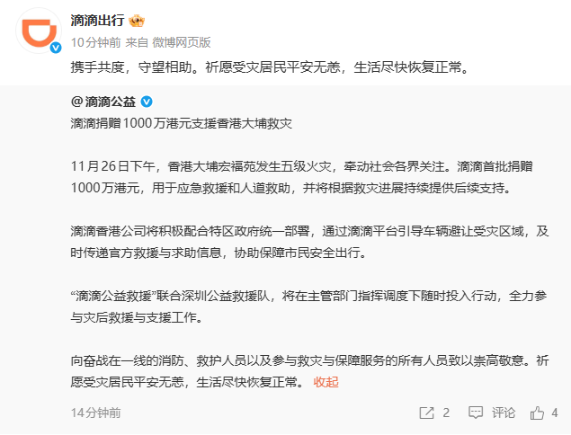 阿里巴巴集团宣布启动首批捐款2000万港元,支援香港火灾救援及后续过渡安置、生活物资补给、情绪疏导等。同时,阿里巴巴集团已启动应急救灾响应机制,旗下菜鸟等业务正调动最近距离食物、被褥等应急物资,送往受灾地,帮助有需要居民渡过难关。