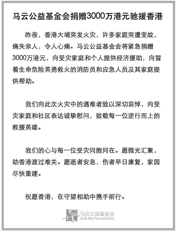 马云公益基金会宣布紧急捐赠3000万港元,向受灾家庭和个人提供经济援助,向冒着生命危险英勇救火的消防员和应急人员及其家庭提供帮助。