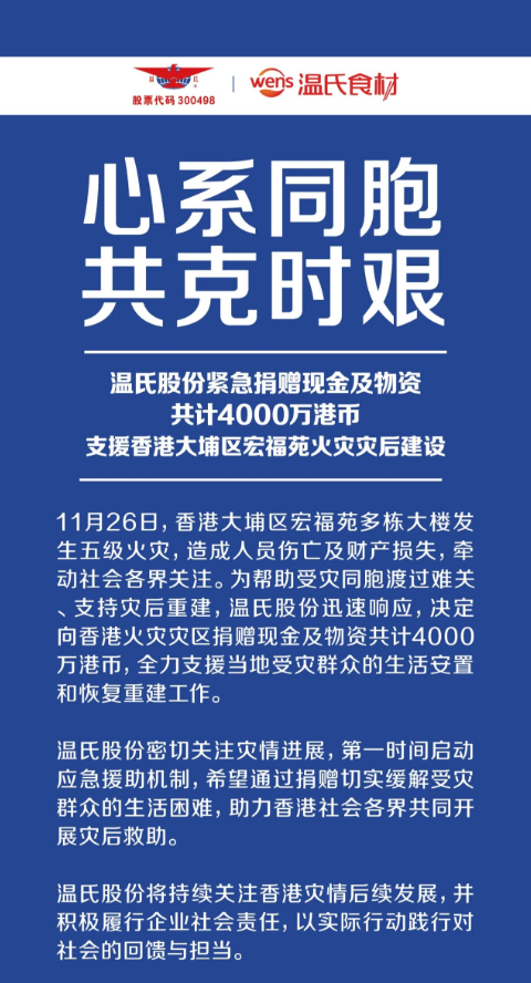 温氏股份宣布向香港火灾灾区捐赠现金及物资共计4000万港币,全力支援当地受灾群众的生活安置和恢复重建工作。